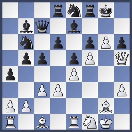Na het betere gooi- en smijtwerk waar Nico de hele tijd groot voordeel had kreeg Frits één kans. In deze stelling is Lh4! de aangewezen zet. De verdediging is op orde en na Dxg2 kunnen de witte stukken in het doosje. Helaas. Lh2 werd gevolgd door Pfg5+ en Dxd6 en zwart is kansloos. (4½-1½, maar virtueel: 1½-4½)